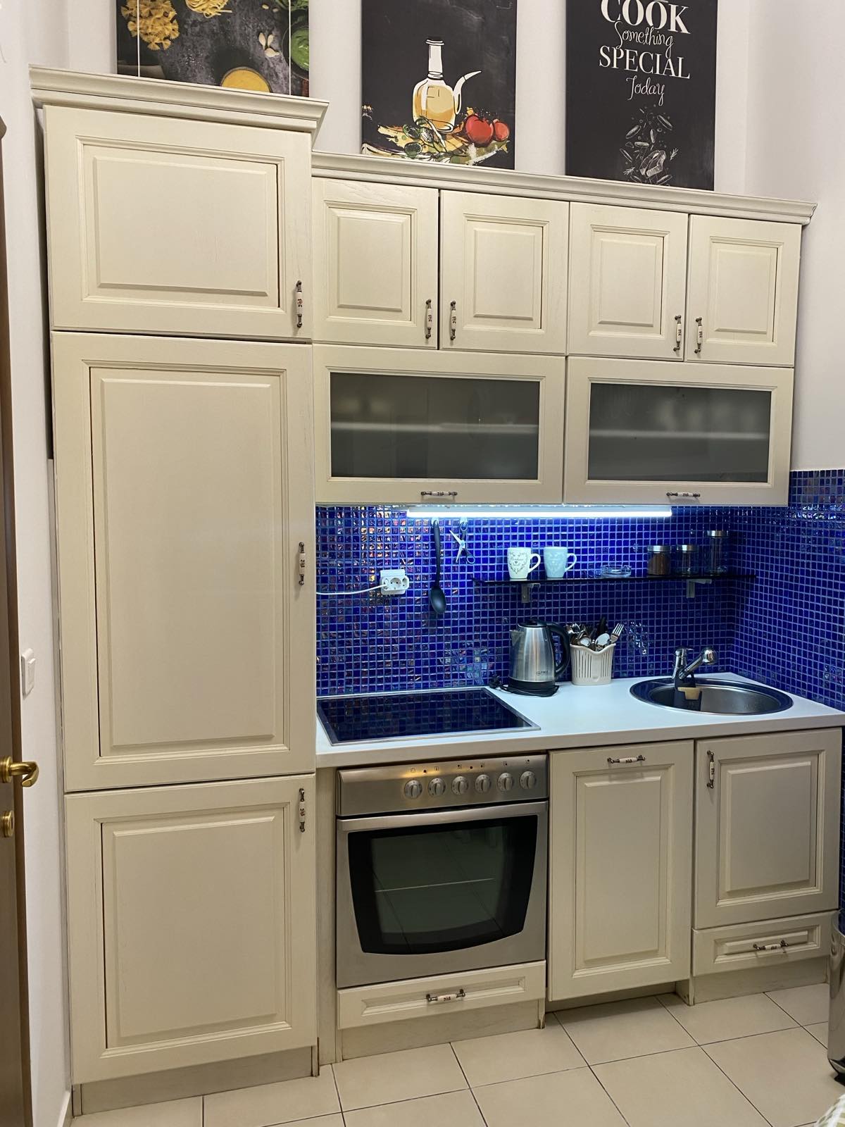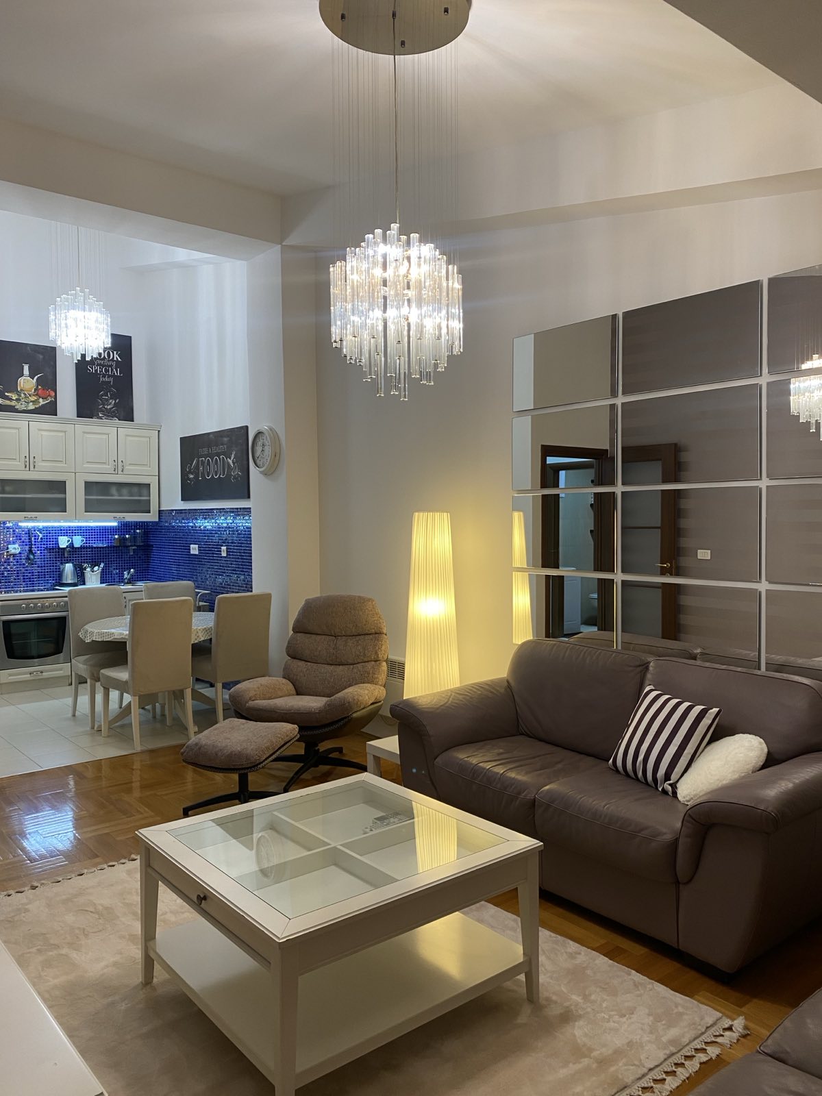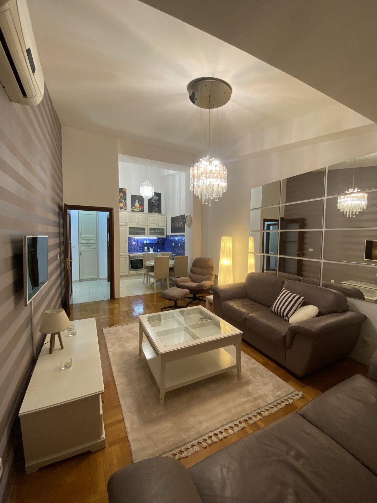 Potpuno opremljen modernim i kvalitetnim namještajem, kompletnom bijelom tehnikom i svim što je potrebno za domaćinstvo, wifi, LCD , klimatizovan, blind vrata, balkon sa ugradjenim alu.roletnama itd.